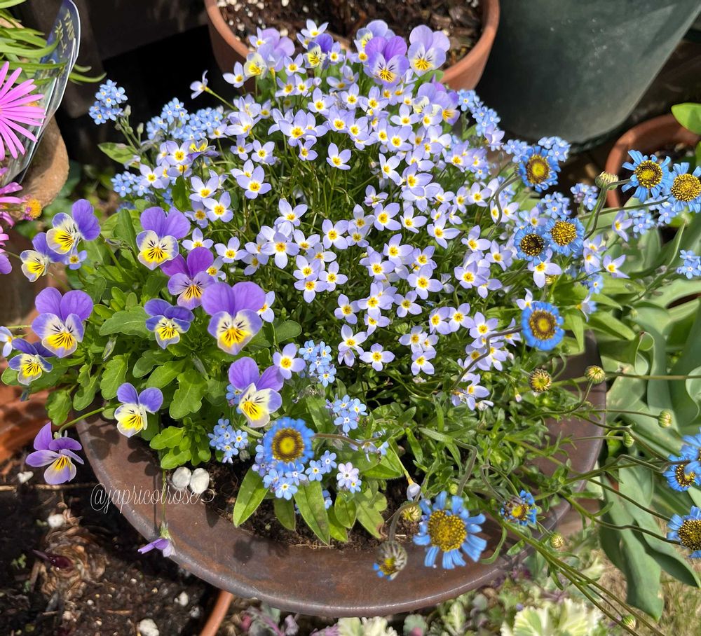 ①ヒナソウとビオラ・リトルコニー、ワスレナグサ、キングフィッシャーデージー