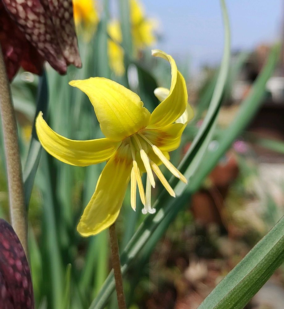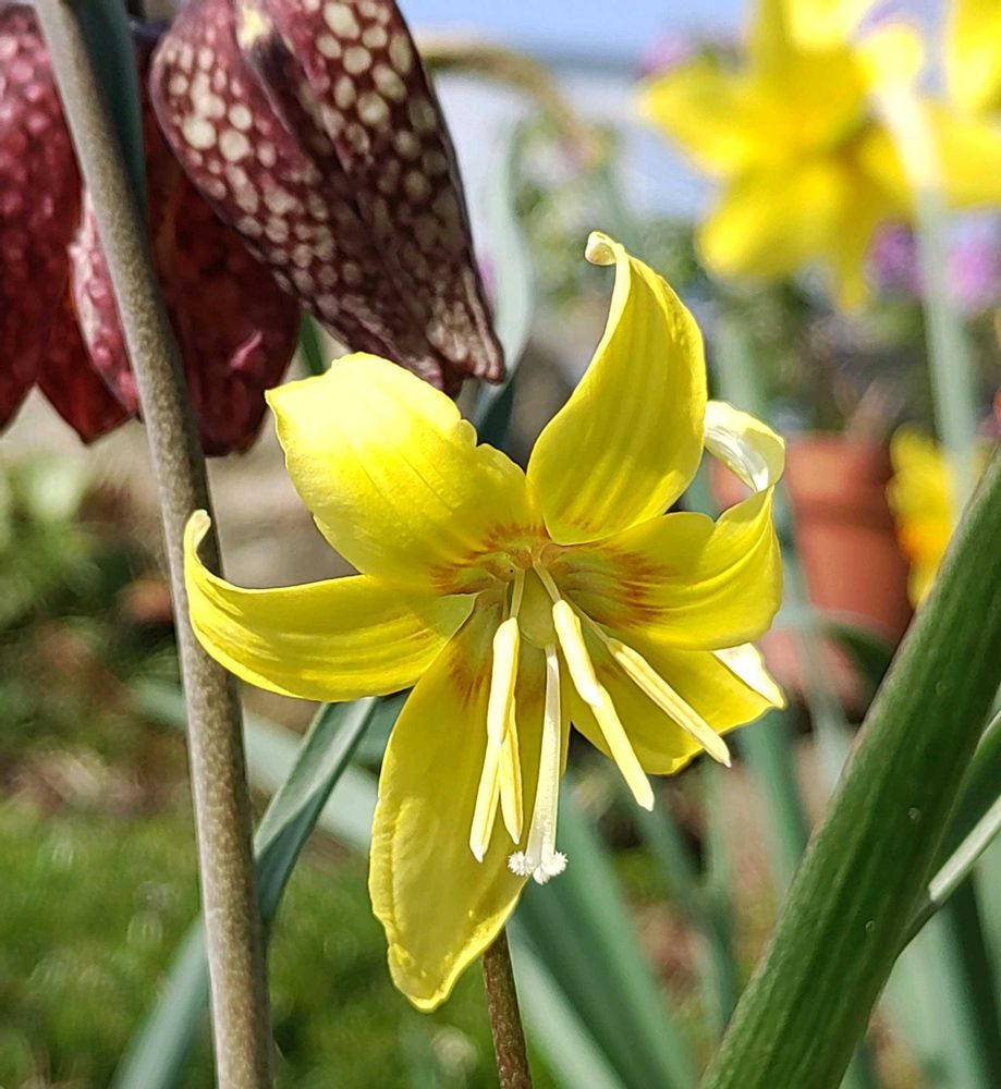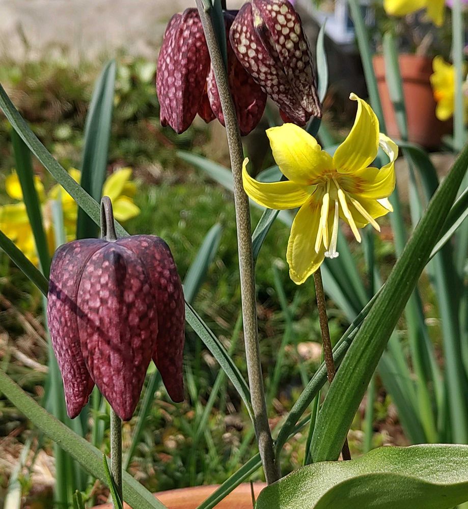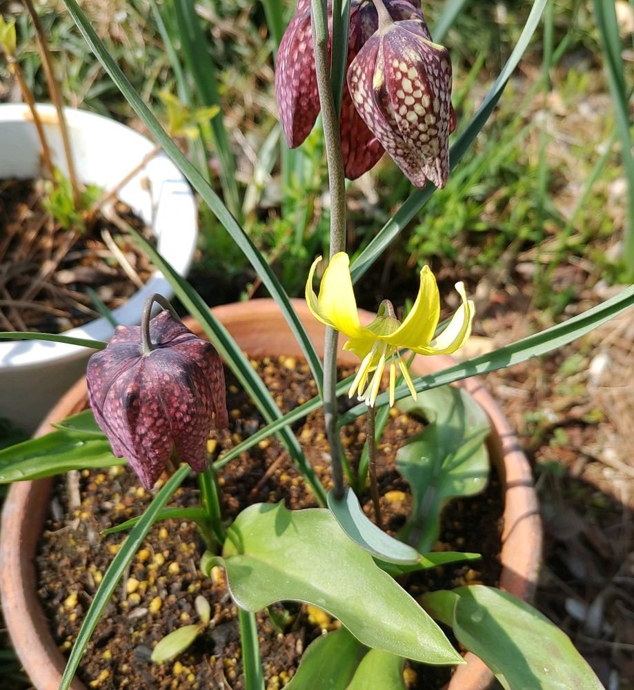 去年フリチラリアの球根の袋入を植えたら黄色い花も咲いたの😲