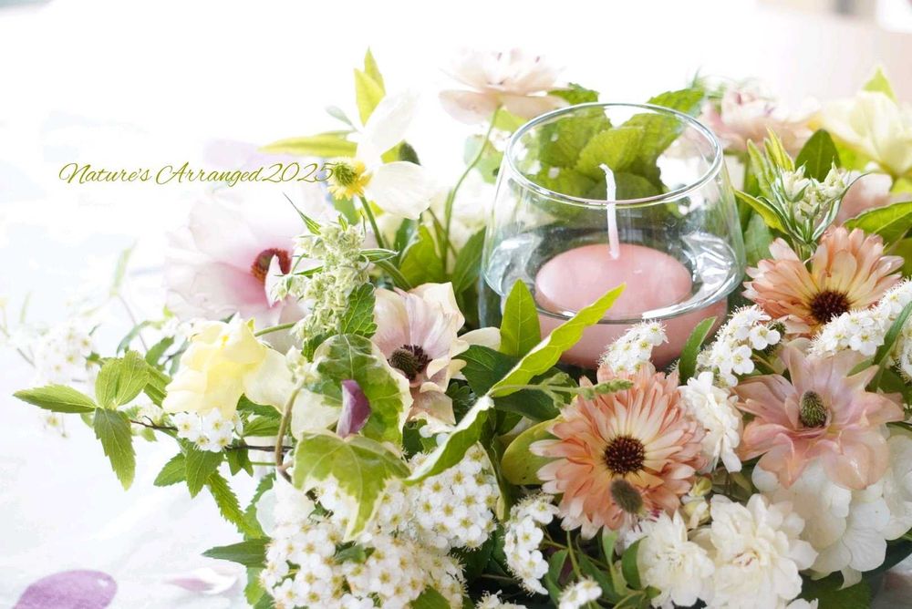 フローティングキャンドルに優しい色合いのお花が素敵ですね(人*´∀`)。*゚+