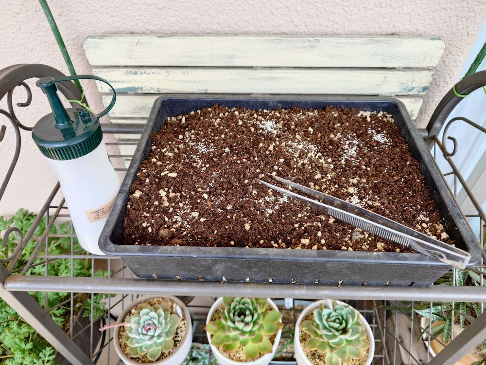 多肉用土に多めの培養土を混ぜオルトラン粒剤を撒きます。