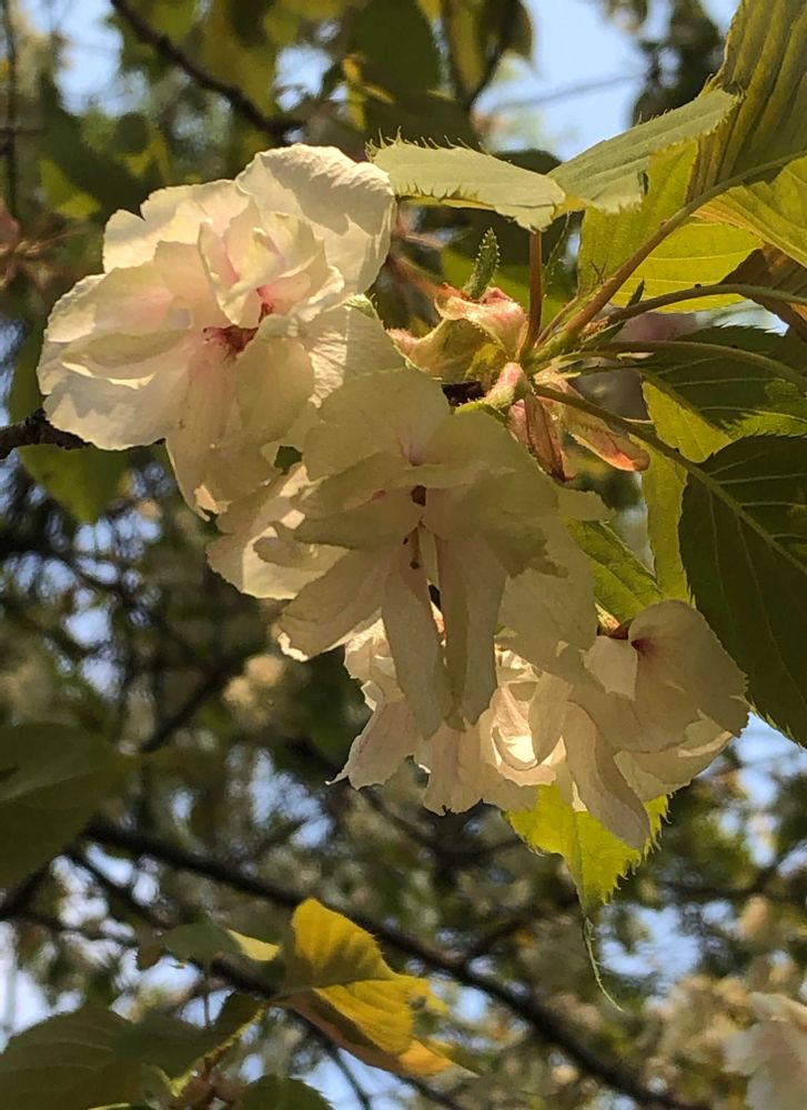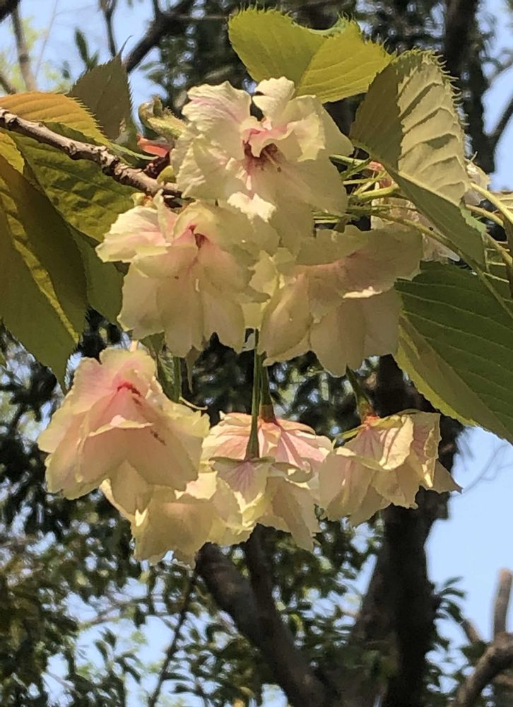 薄黄緑色の八重桜「鬱金(ウコン)」をパチリ!📸🌸🌿😊😄🌞✌️