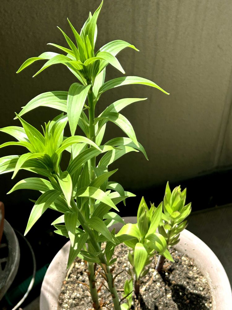 1月に買って植えた、カサブランカの球根2つから、芽がグングン育ち、すでに花芽らしきものをつけております。楽しみです🌷
