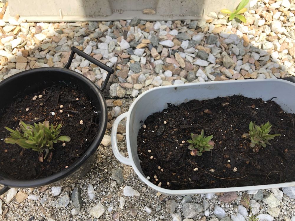 他の苗も別の鉢に植えかえてみました。根がうまく取れなかったので少し心配です。今年はひまわりの芽もなめくじにやられず生き残ってます。