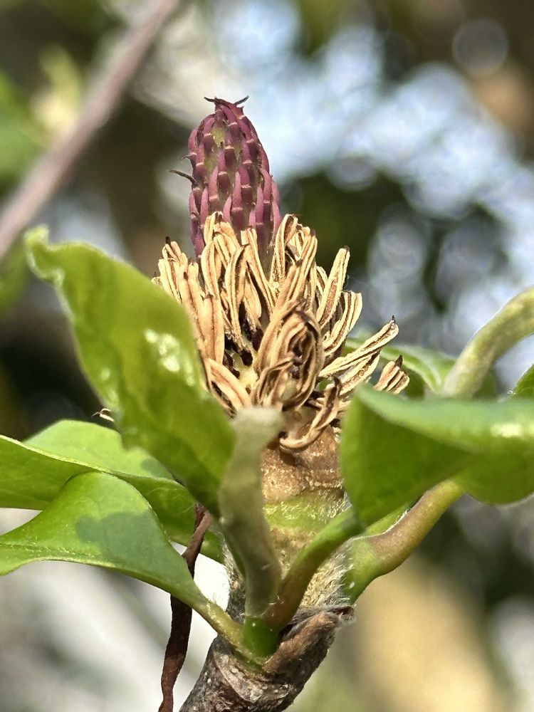 硬い蕾の長い時期を経てやっと咲き出したシモクレンも、ヒラヒラと花びらが落ち始め、葉っぱも出てきました。