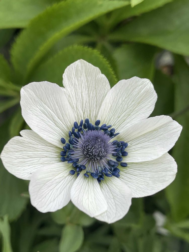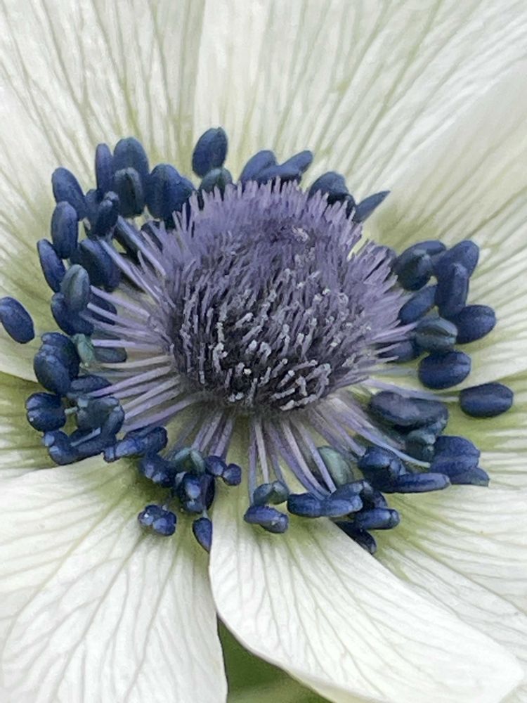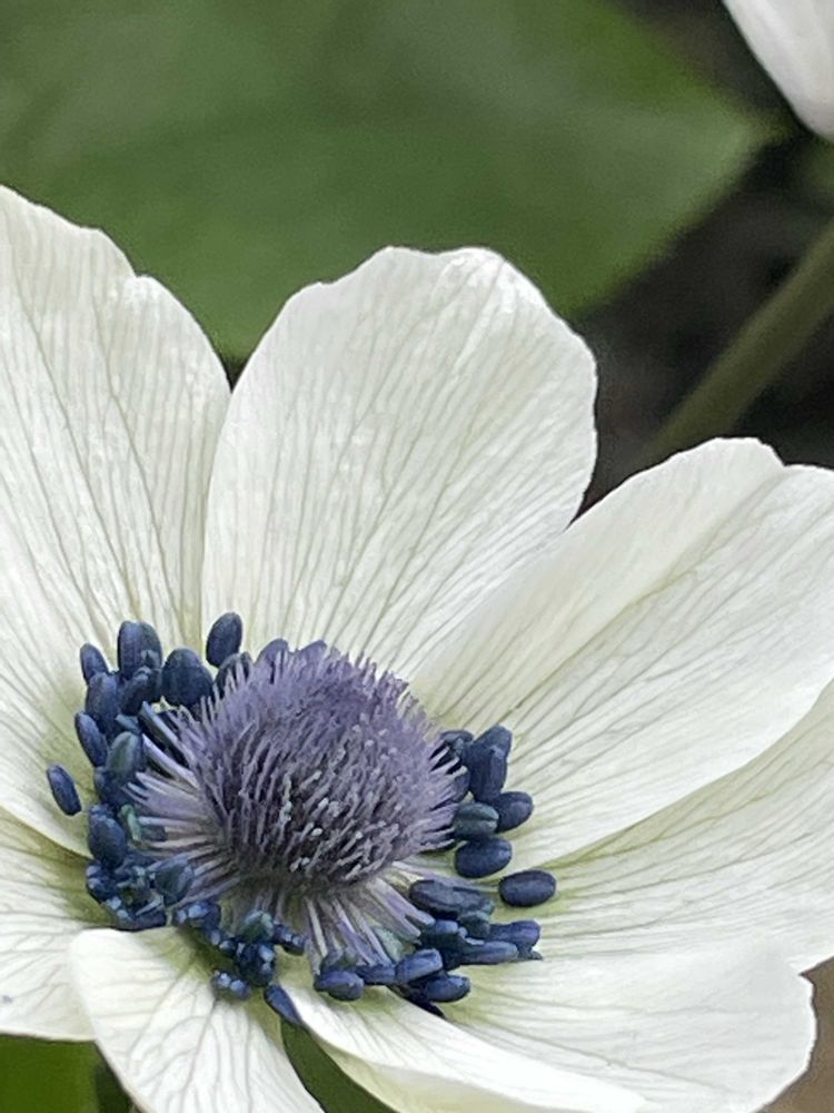 薄い花びらに脈の線がスーッと伸びて、白い花びらなのに蕊の辺りはほんのりグリーンがかってて、藍色のしべの下の茎は柔らかいパウダーグレー、雌蕊のまんまるはパープルがかったパウダーグレー