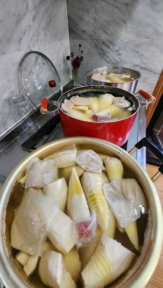 今、茹で上がり、明日は1日中 良く水に晒してからビン詰めタケノコにします。感謝感謝です。