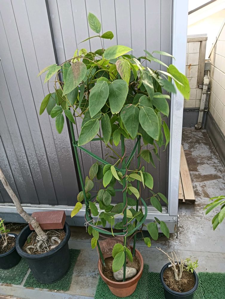 沖縄県北部にしか存在しないイルカンダの挿し木苗。去年の今頃に沖縄から長い枝を頼み挿し木しました。やたらに枝が柔らかいく曲がると思ったら国頭村の大綱引きの綱の強度を増すために編み込まれるそうです。ちなみにイルカンダ自体がウチナーグチでイルは色カンダはカズラの事です。別名をウジルカンダと言いウジルは三線の太い弦の事を示し蔓が人の太ももくらいになります。やんばるの森の中に自生して蔓が何百メーターになり大木に巻き付き成長するそうです。以前に大阪の大学が温室で花を咲かせましたが実生から30年かかったそうです。おそらく鉢で花を咲かせた記録がないので挿木で親のクローンを作っても花が咲くかわかりません。成長はずば抜けて早いので今後の管理が大変になりそうです。しかし耐寒性はあり関東圏なら冬は外で越せますがだいぶ葉が傷み落葉します。2鉢あるので冬は室内と外に置いて色々実験中です。ちなみに大分県の蒲江にイルカンダの近縁種のカマエカズラがあり他に熊本県山鹿市にこれまた近縁種の樹齢1000年を超えるアイラトビカズラがあります。近年はイルカンダが咲くと沖縄の新聞やテレビで取り上げられます!