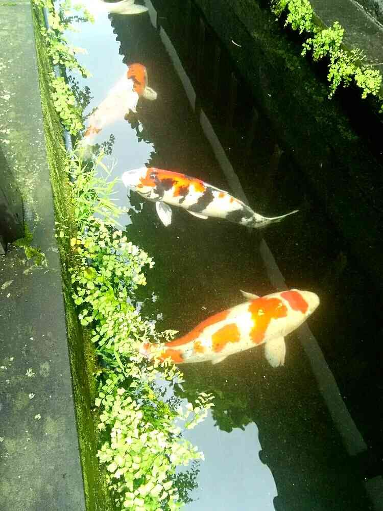 大きな鯉!!水路の際に育っているシダ?が涼しげですね。🌿✨