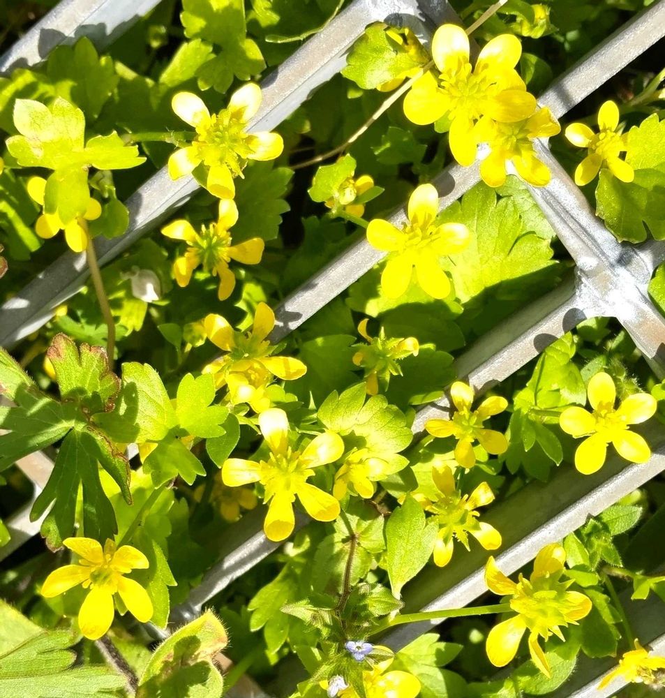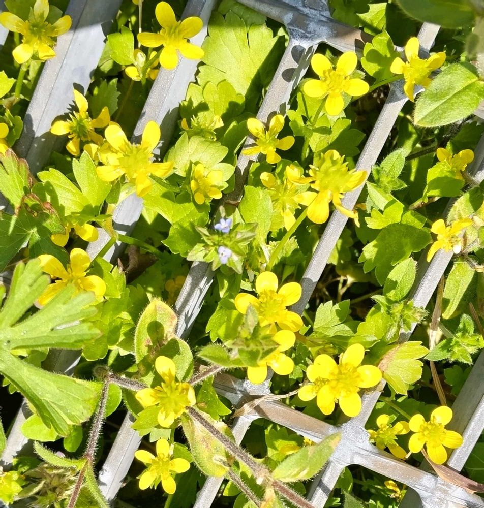 駐車場の溝の格子状の蓋の隙間からテカテカ光る花を沢山咲かせていました❗️