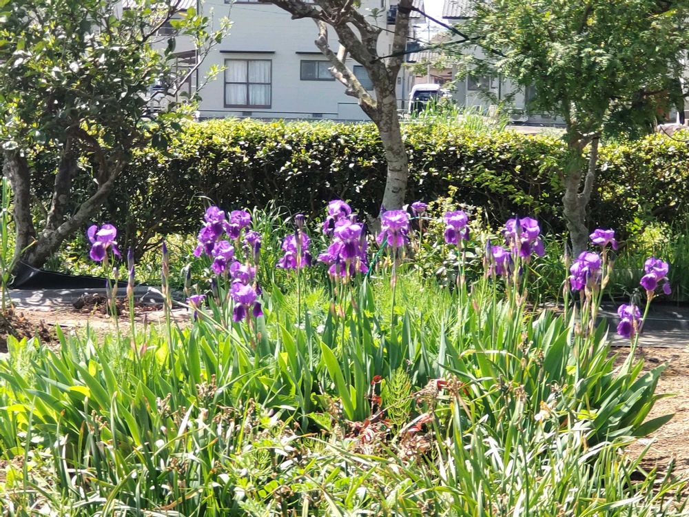 お多福ガーデンのご近所さんの裏庭に芝桜、前庭にはジャーマンアイリス!?ちょっとわかりませんが、早々と満開に咲いてました。