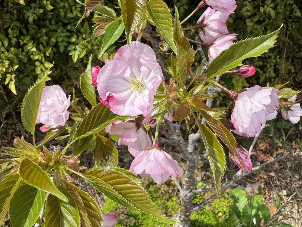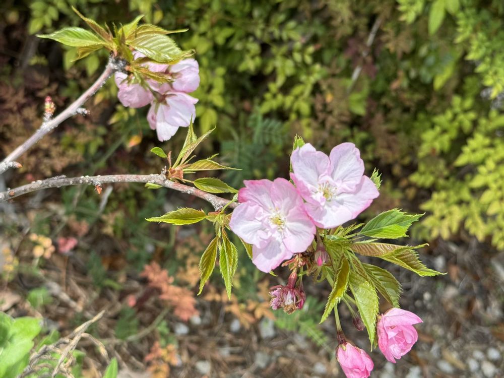 周辺の桜が終わって二週間ほど経ってから花と葉が一緒に出てる感じ。