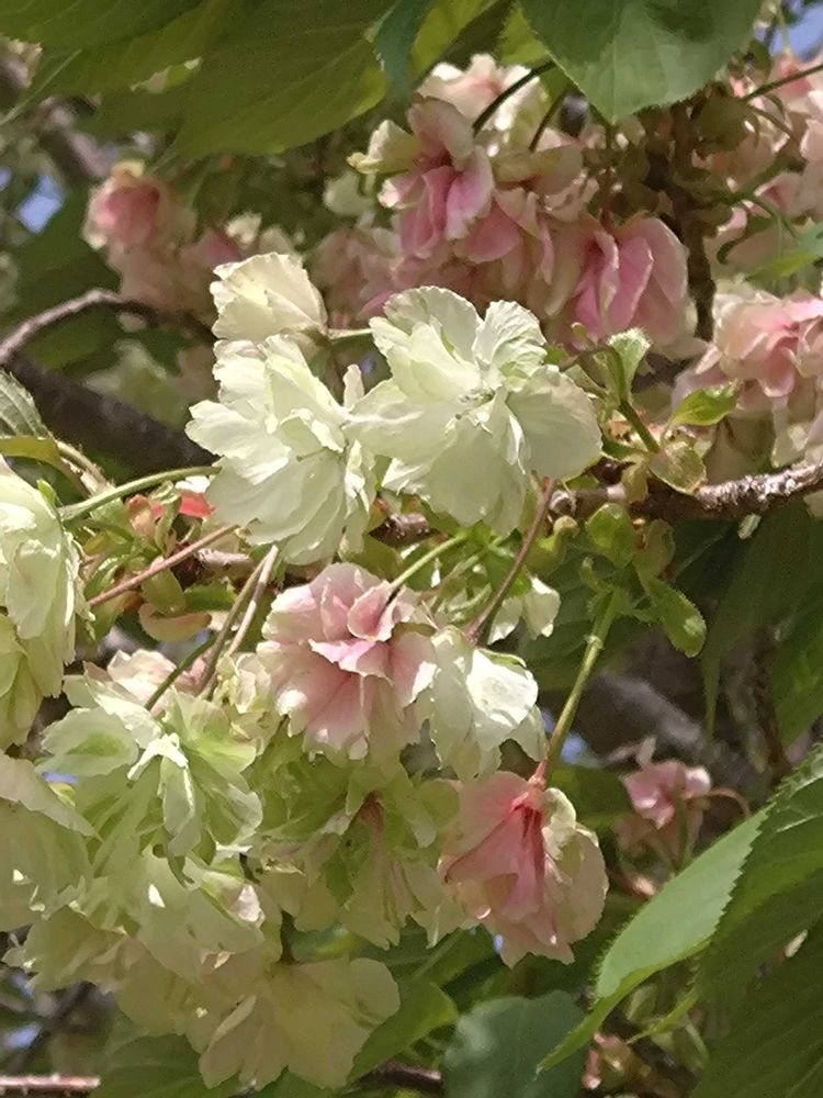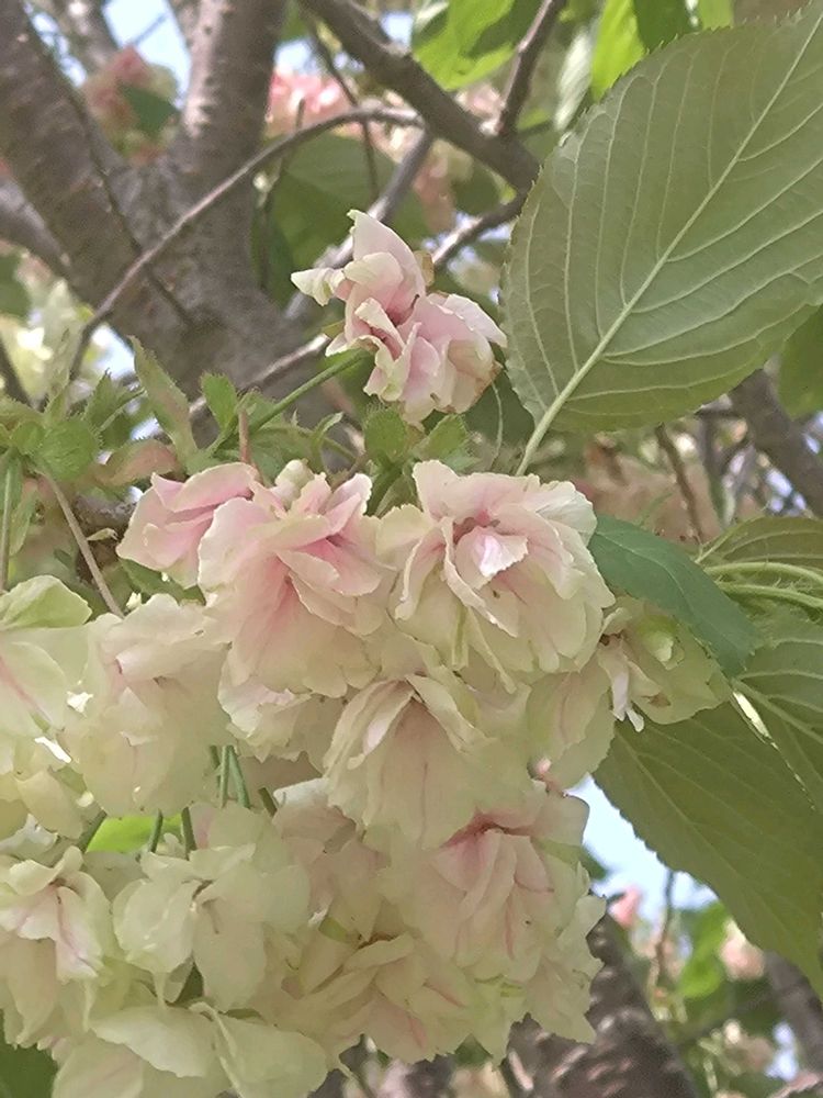 鬱金桜。一週間前に見た淡いグリーンからピンクに色変わりしていました。