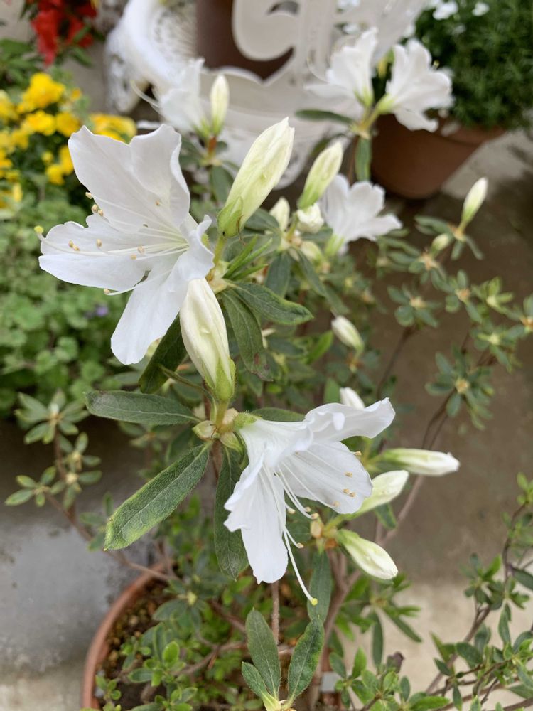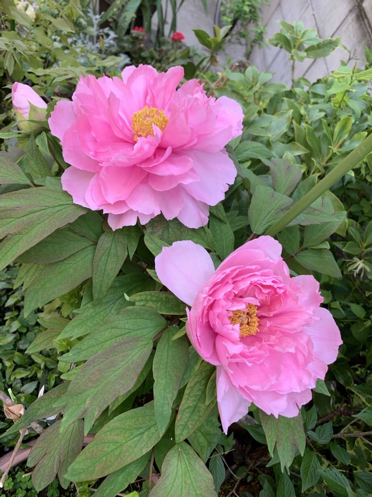 ①ボタン ②白ツツジ ③赤ゼラニウム ④⑤ギボウシ色違い