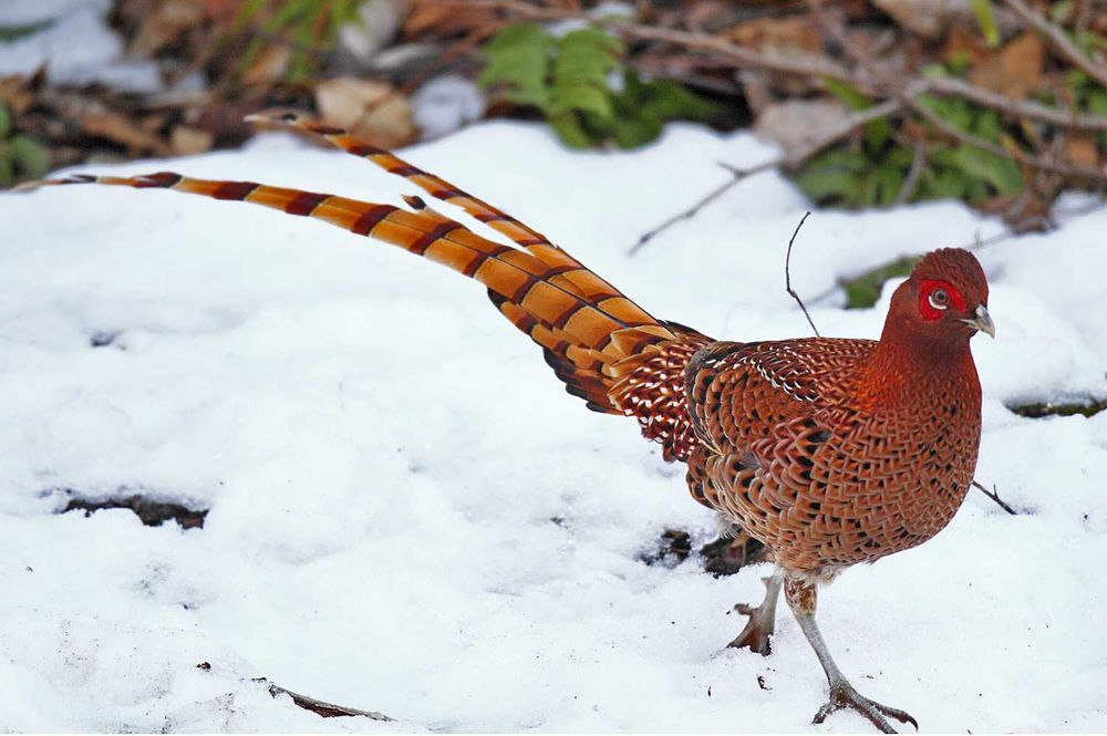 ヤマドリの赤い色が、雪の中で映えますね✨