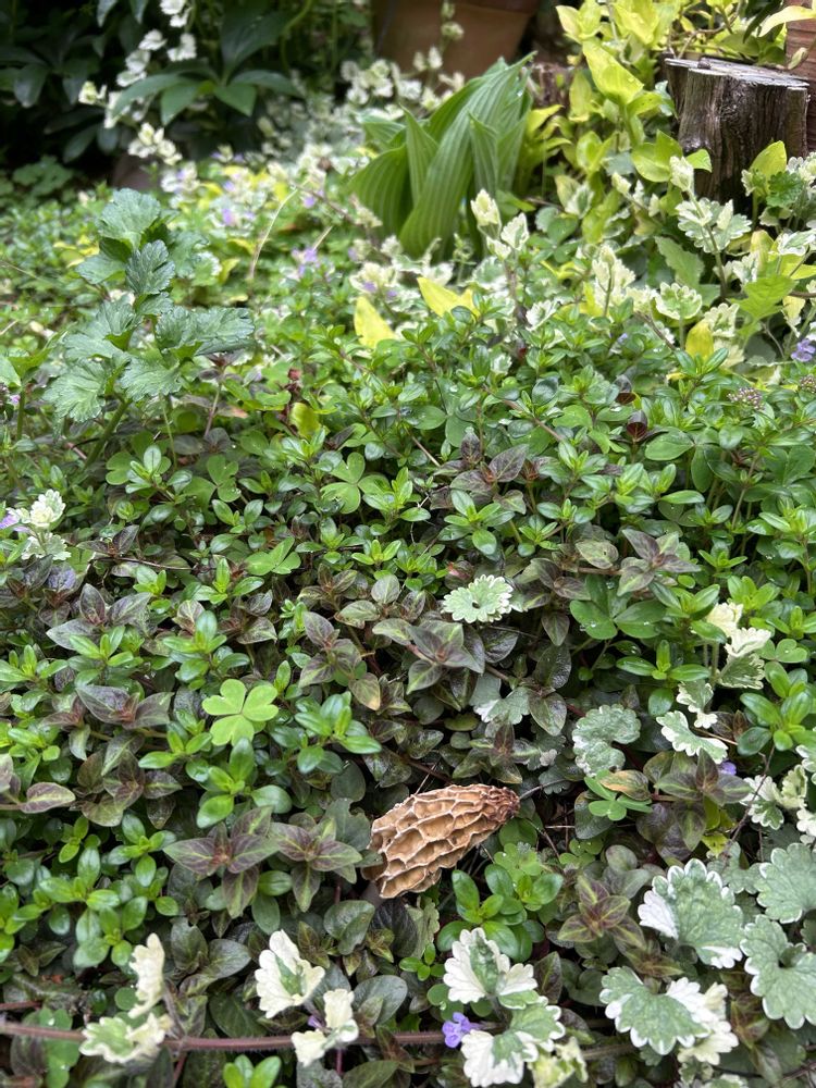 草花の中にモジモジしながら生えてるアミガサタケが何か可愛いね🤭🎶