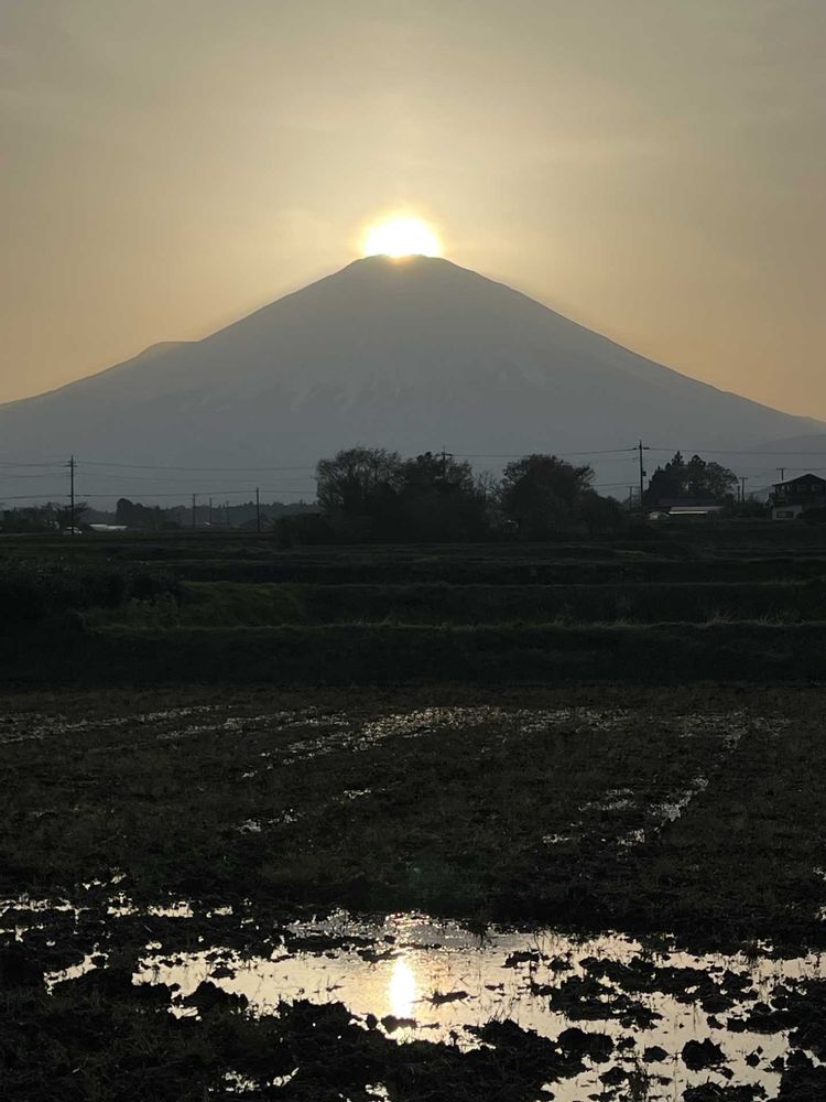 ひみつのアッコちゃんさんの夕陽のダイヤモンド富士,日没直後の飛行機雲,日没後に田んぼの水鏡に映る逆さ富士の投稿画像