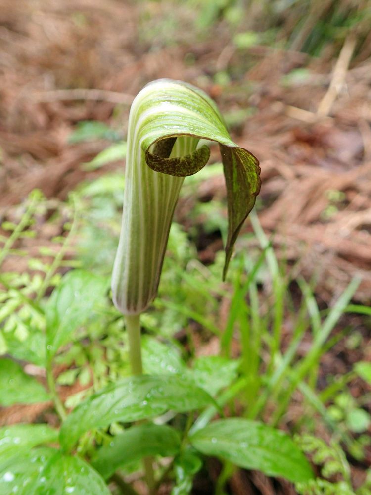 1枚目2枚目はウラシマソウ、その名のとおり浦島太郎が竿を持っているような姿。3枚目4枚目はマムシグサ、柄が蛇のマムシのように見えるから。同じテンナンショウ属でもウラシマソウ、マムシグサ、他にテンナンショウと名前がばらばらです。😂😭