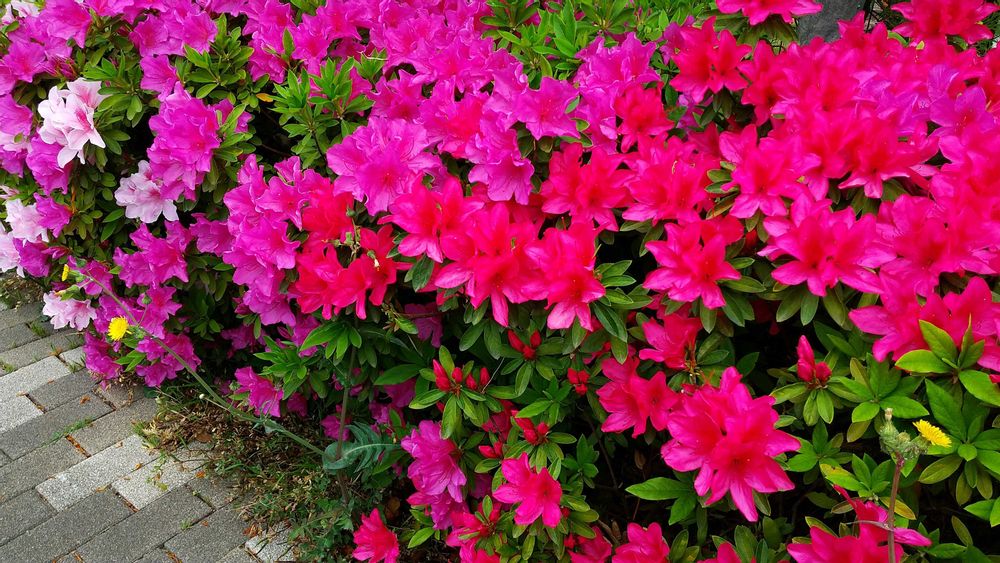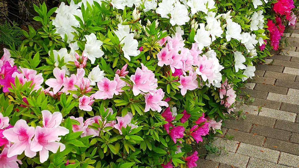 濃いピンク、薄いピンク、白のツツジが毎年咲き乱れています。