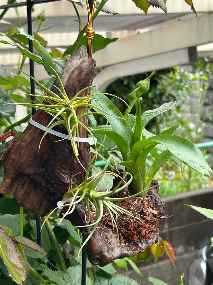 流木にネオレゲリアさんとエアープランツを着けてみました。
