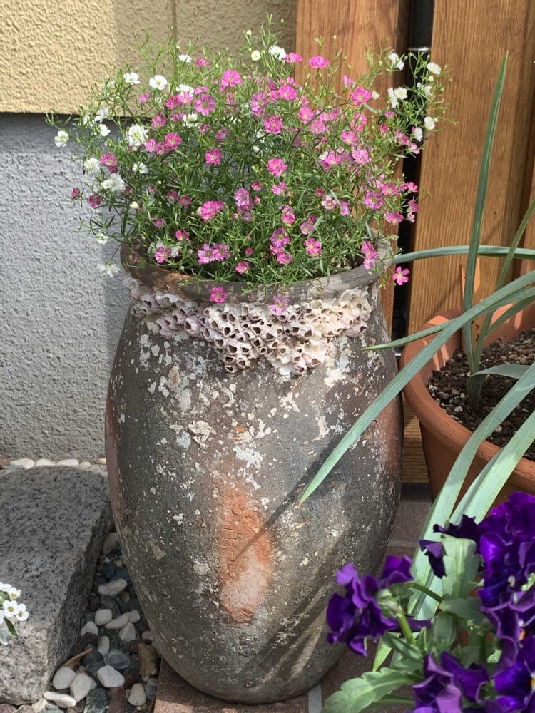 お気に入りの蛸壺にカスミ草を植えてみました。