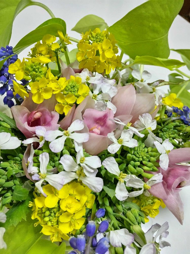 💐ポトスを使って、庭から採取のシンビジュウム、ダイコンの花、ハクサイの花、ムスカリのアレンジ。