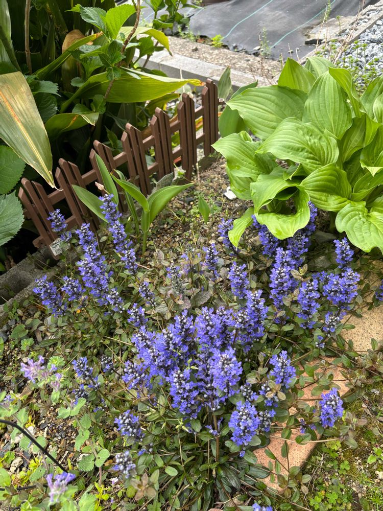 ホスタが大きくなり、アジュガが満開です