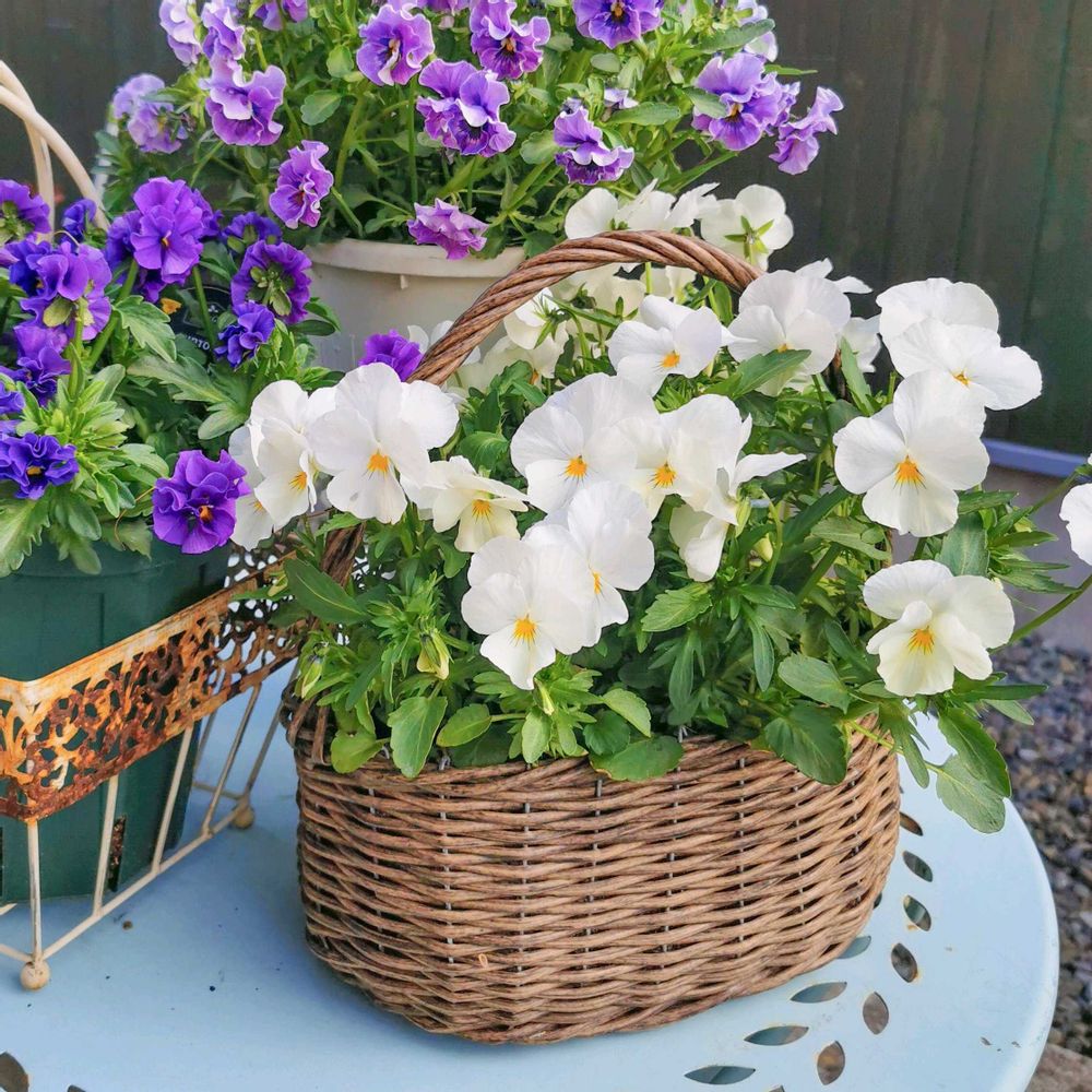 バスケットには、白いビオラの親株と挿し芽を植えています