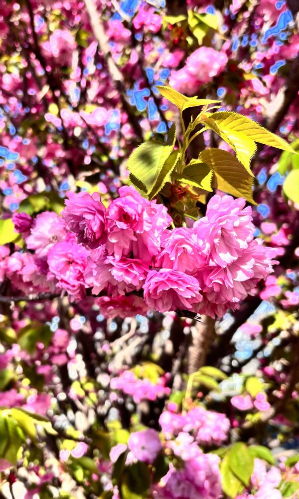 濃紅色で八重咲きの大輪の花を枝いっぱいに咲かせる。