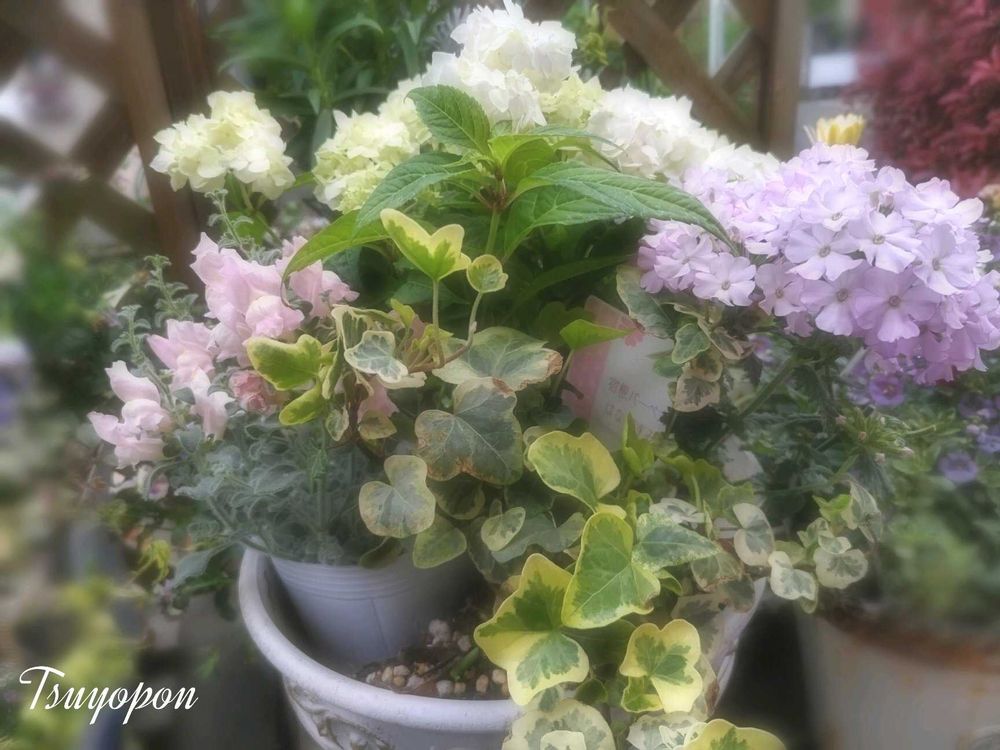 パンビオさんの寄せ植えで使っていたヘデラさんはそのままで、最近お迎えしたお花をポットのままイン😉
