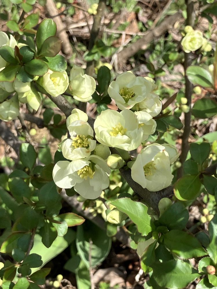 花ボケの白い花、今年は、少し緑ぽい花になりました。‼️