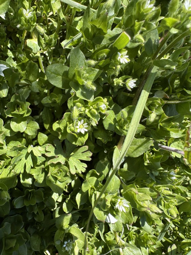 足元にあったハコベ、緑が鮮やかで葉がコハコベより大きく花が葉に包まれてるような姿。これ、多分ミドリハコベでいいと思う😍