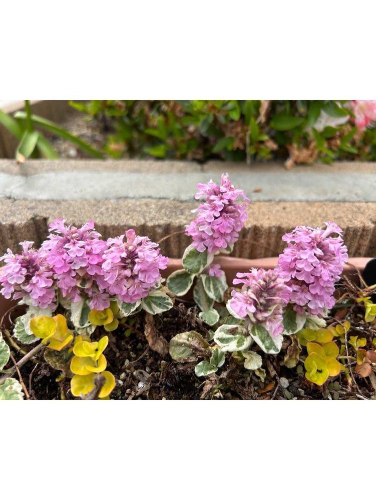 斑入りのアジュガ、草ボーボーの庭で減ってきちゃってたから鉢上げしたら今年は立派な花が咲いてる💕