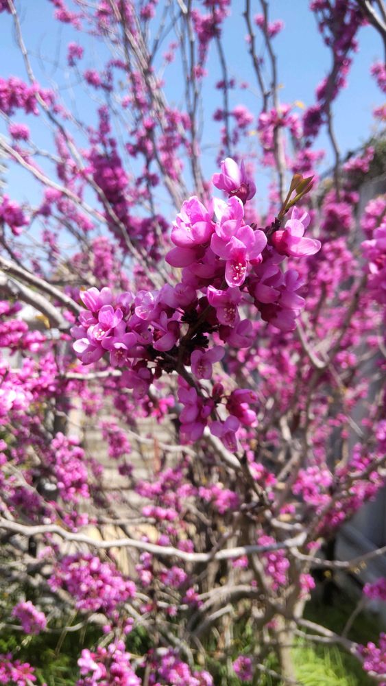 街中散策で出会ったハナズオウ(花蘇芳)が 濃いピンク色のちっちゃな花を枝いっぱいに咲かせています。