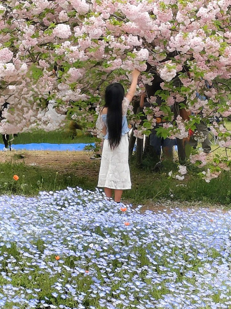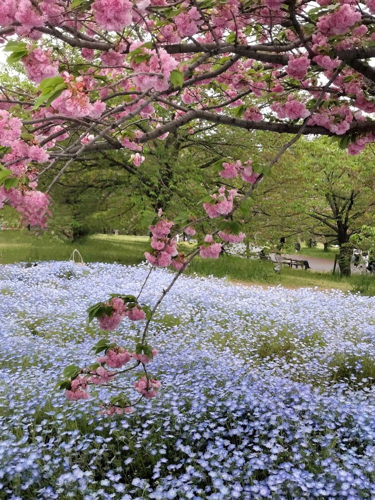 八重桜とブルーのネモフィラの花、綺麗ですね〜ウットリします😍