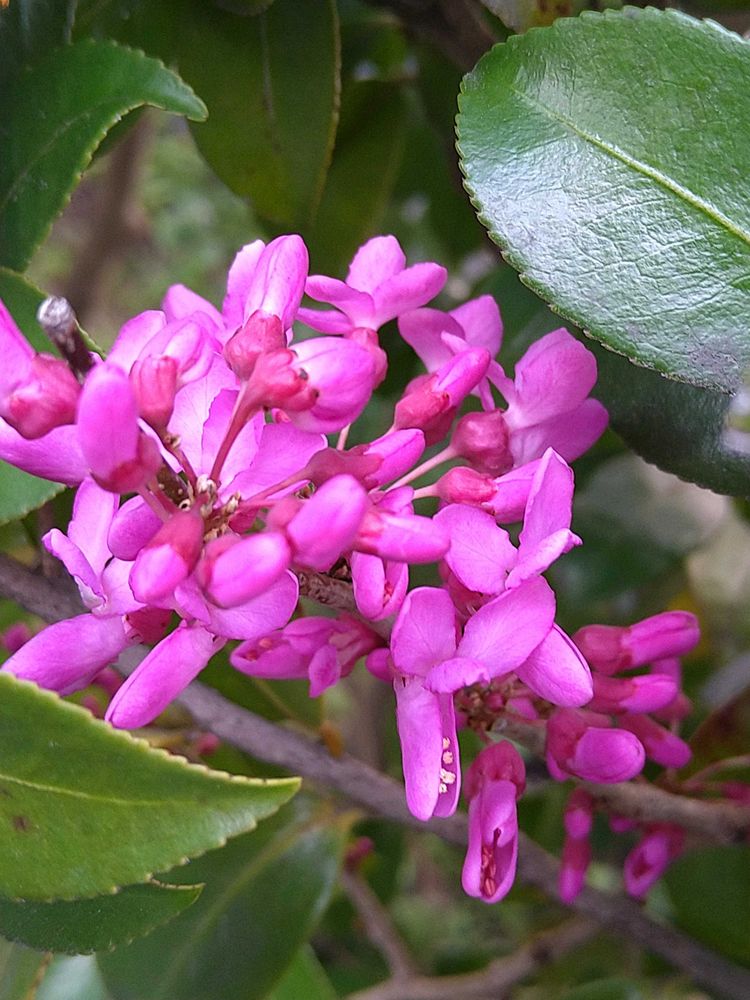 ⑤ サザンカの生垣の中からのハナズオウ🩷😄