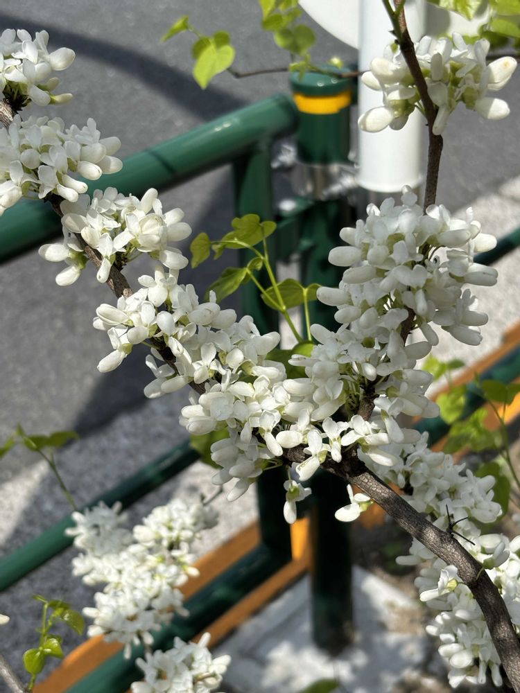 ハナズオウに白い花もあったんですね。空気悪い所でがんばって咲いてる近所の街路樹です4/17撮影