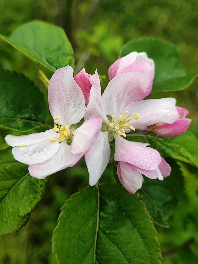 本日の家庭菜園。リンゴ アンビシャスの花がよく咲いています。木も1年で一気に大きくなったんですが、花も大きくて可愛いです。今のところ人工授粉はしないでいるので、実は期待せずにお世話だけしっかりさせてもらいます。