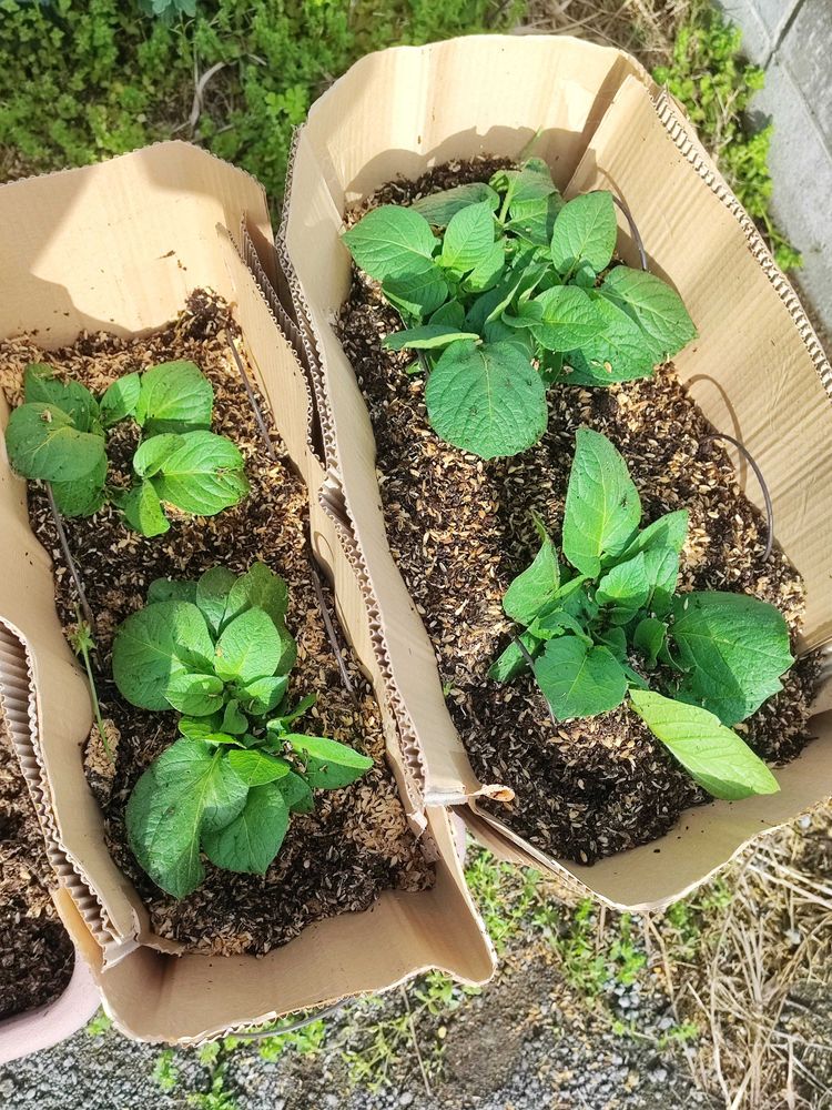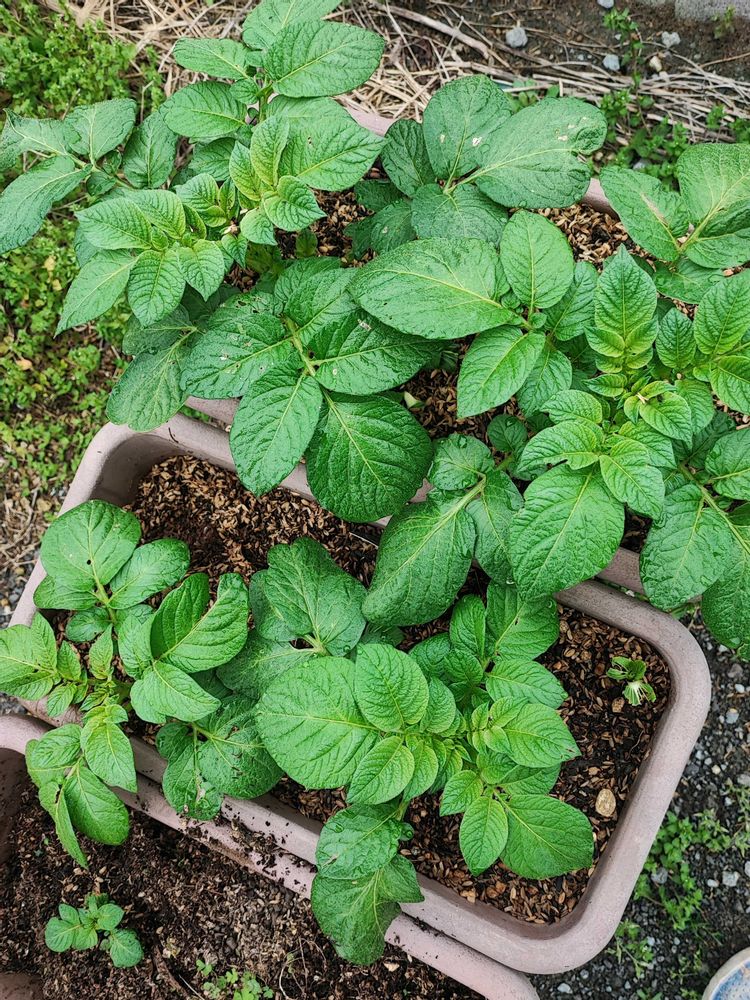 パントリーで芽が出た種芋からのじゃがいも、35cm位の深型プランターの半分位の深さに植えていたのに、もうプランターの深さを超える所まで成長してしまい、これ以上土寄せ出来なくなったので、前から持ってる100均のガーデンフェンスと段ボールで30cmくらい高さを継ぎ足しました。こんなにぐんぐん育つと思っていなかったので、とても楽しいですw