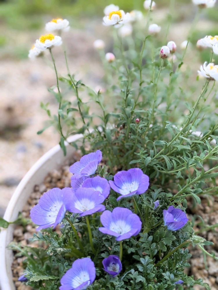 ネモフィラ🩵、はなかんざし⚪️🔸小さい花びらで丸っこい 愛らしい🥰お庭に 春の花が いーっいぱい 華やかな雰囲気GOOD👍(o^^o)ゆるりと 植物の成長を楽しみましょうねー🎶😆💕