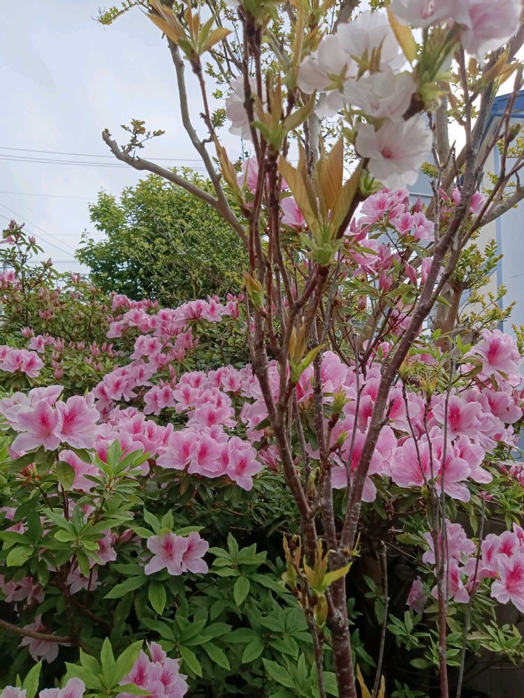 開花しました〜ツツジとのピンクコラボ…八重咲き薄っすらピンクと濃いピンクのツツジが可愛らしいです