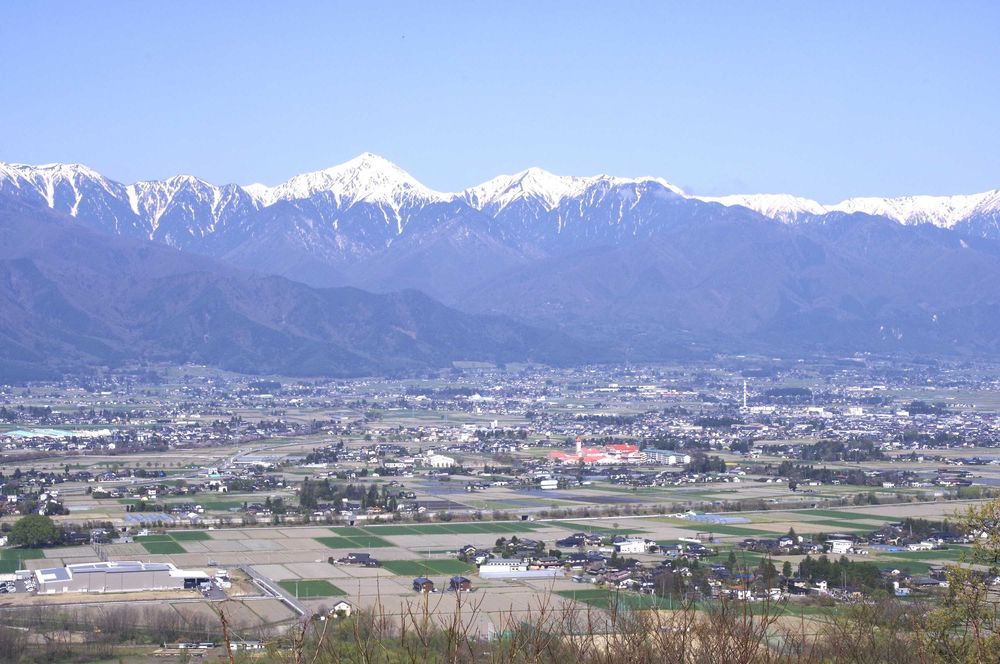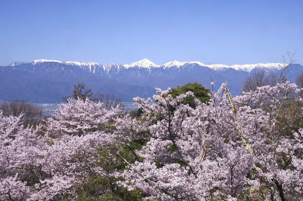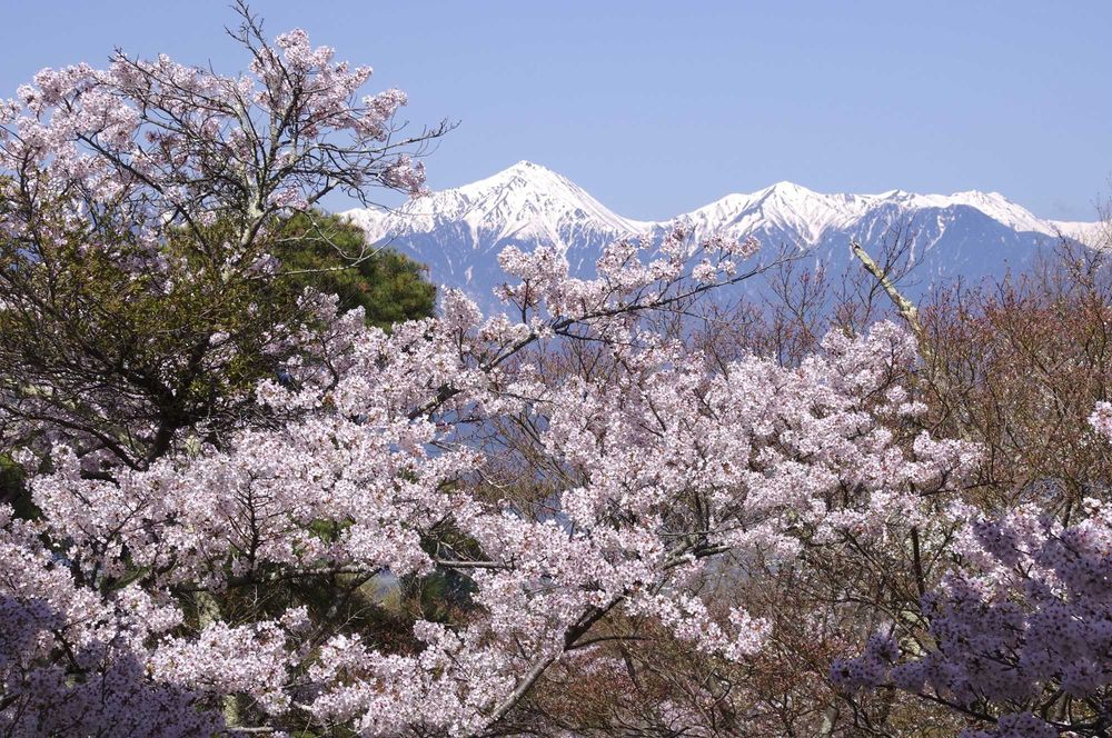 残雪の北アルプスと桜 信州ならではの景観ですね。