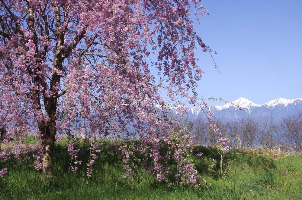 少し下がった駐車スペースからの枝垂れ桜と常念岳そして安曇野