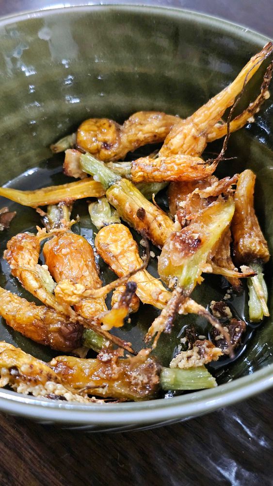 失敗にんじんの成功レシピ🥕。間引きしそこねてギチギチにひしめいていたチビにんじんをにんにくと粉チーズでグリル焼き。中は甘くてヒゲはパリパリ。つまみにもってこい!