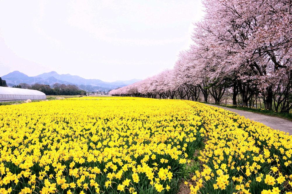 群馬県の東吾妻町は、国内有数のラッパ水仙の名所で、写真の畑には30万本の水仙が黄金色の絨毯を敷き詰め、吾妻川と畑の間には1kmに渡り桜並木が続いています