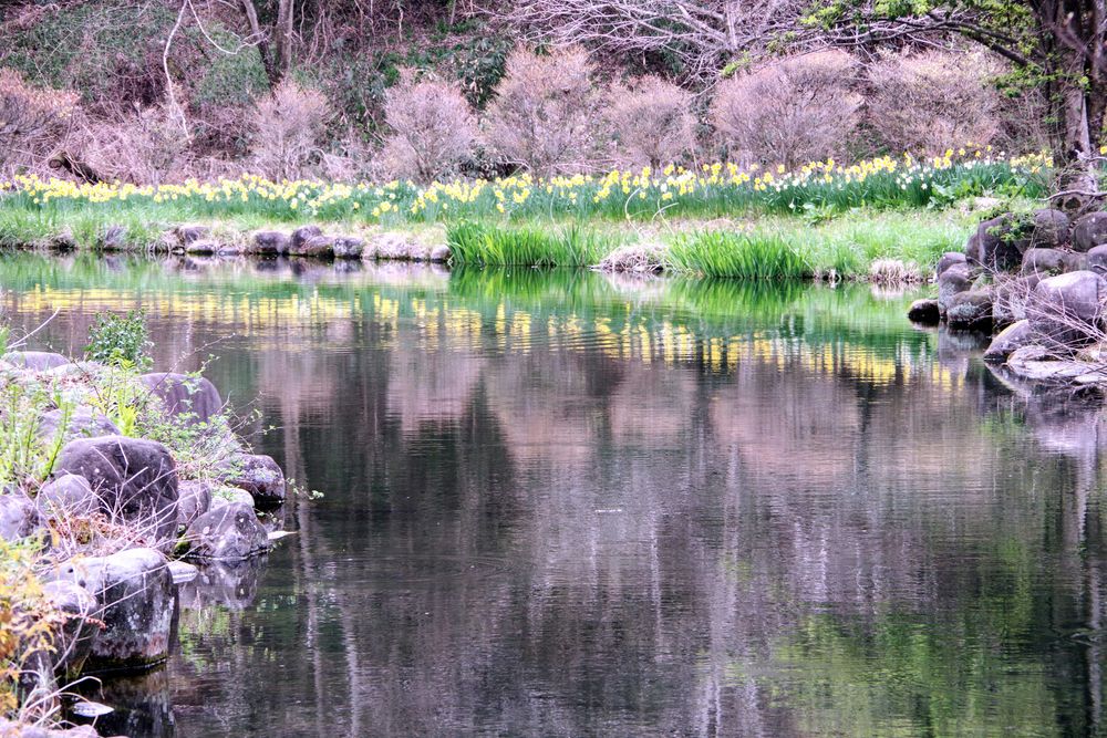 一面のラッパ水仙が花の海原のように耀き、その波を受けとめるように桜の並木が切れ目なくリフレクションを魅せている、そのような印象でした🎶☀️