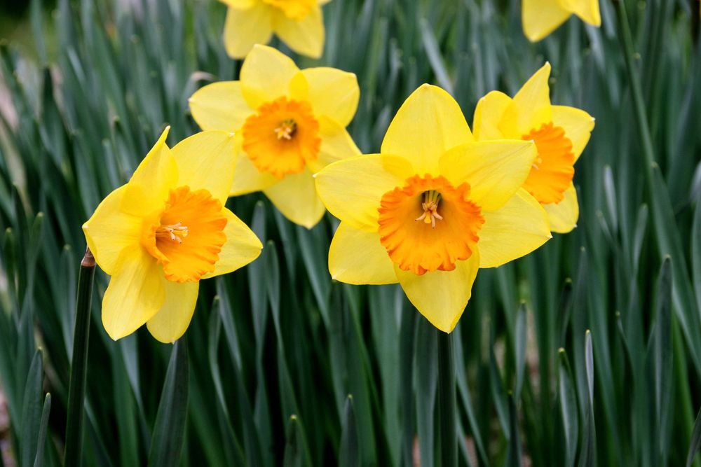 黄金色に耀くラッパ水仙と1kmにも及ぶ桜並木とが、春の畑道を明るく染めていました