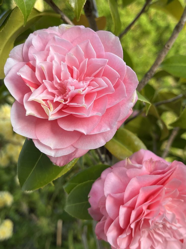 とてもかわいいツバキが咲いていました。バックはモッコウバラ