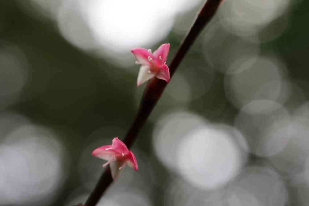 遠くから見ると赤いポチポチの着いた細いお花だけど
