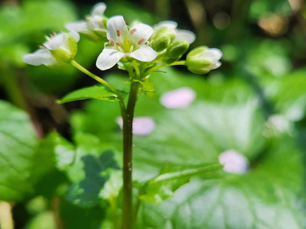 散った山桜🌸が葉わさびの葉っぱの上にも🩷