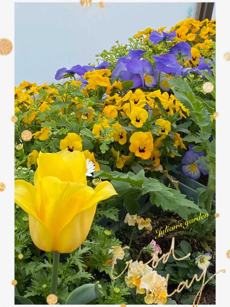 ①もりもりのビオラのミルフルさん🧡💛普通の黄色いビオラ💛💗3年目のフリージアがビューンと他の鉢から伸びて咲いてます💛